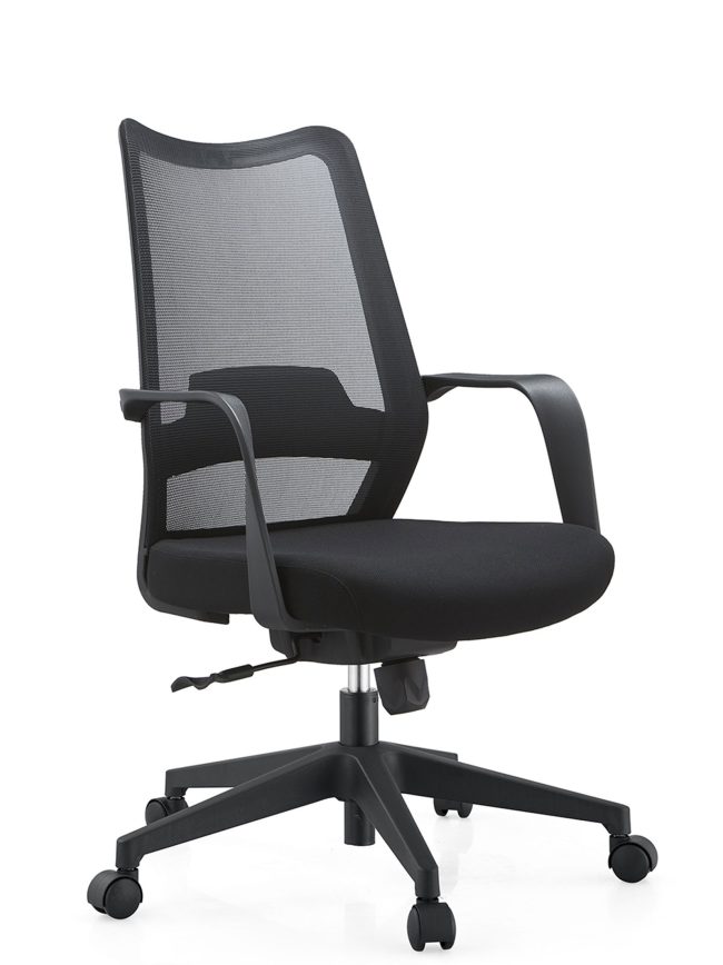 Scaun ergonomic rotativ cu elemente din polipropilenă negre, mecanism oscilant cu funcție de balans și blocare a șezutului în poziție orizontală, spătar tapițat cu mesh negru și șezut tapițat cu material textil negru, bază polipropilenă 640 mm, cilindru cu gaz, role D50, brațe fixe incluse.